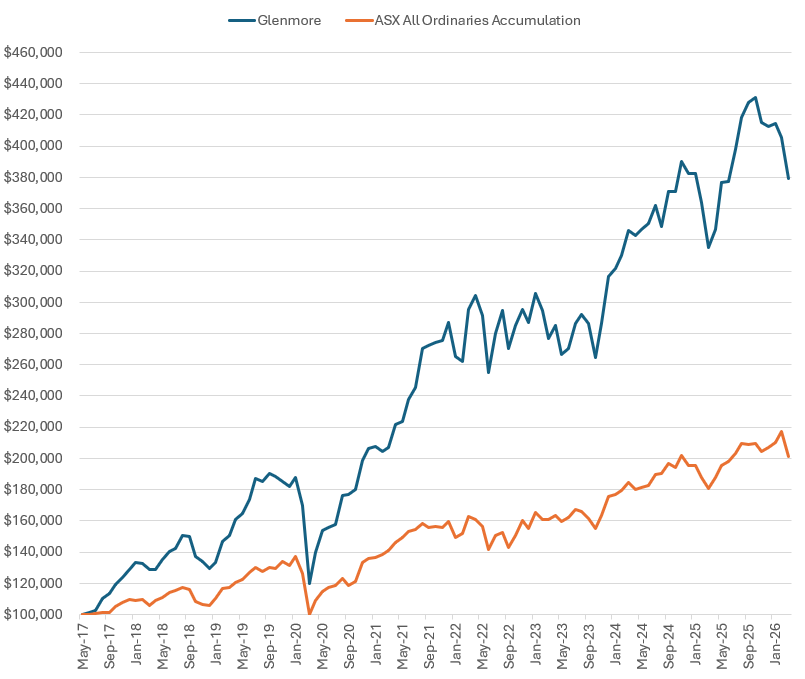 | Period | Glenmore Fund | All Ords. Accum. Index |